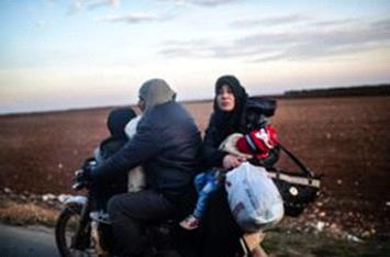 A family leaves on a motorbike as Syrians flee the embattled northern city of Aleppo