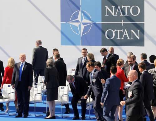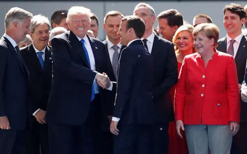 From L-R, Belgium’s King Philipe, Italian Prime Minister Paolo Gentiloni, U.S. President Donald Trump who shakes hands with French President Emmanuel Macron, NATO Secretary General Jens Stoltenberg (partially hidden), Croatia’s President Kolinda Grabar-Kitarovic, German Chancellor Angela Merkel, Canada’s Prime Minister Justin Trudeau gather with NATO member leaders to pose for a family picture before the start of their summit in Brussels, Belgium, May 25, 2017