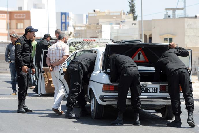 Tunisian Police Special Unit agents check vehicles driving on a road leading the central Tunisian city