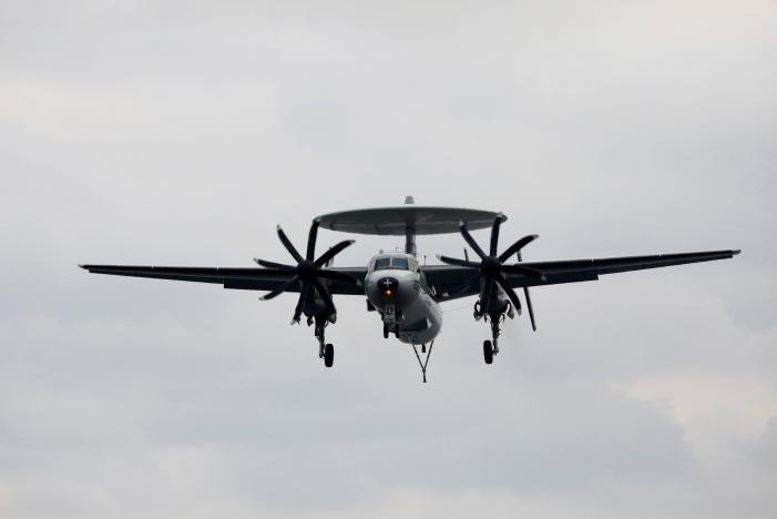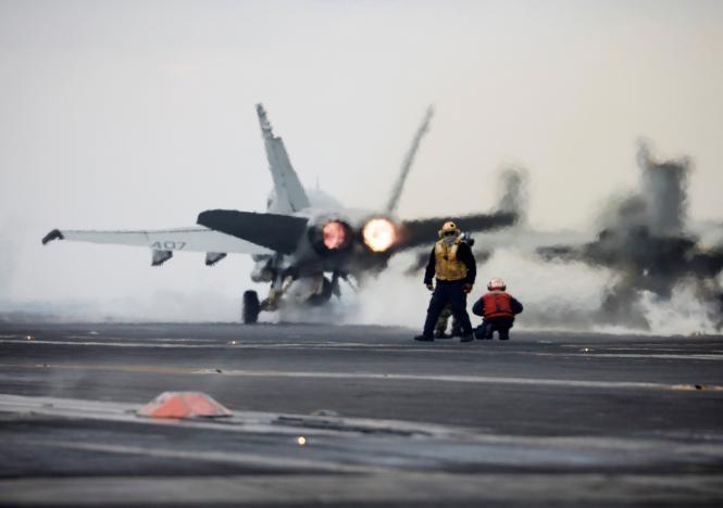 F-18 fighter jets took off from the flight deck of the nuclear-powered carrier in a dramatic display of U.S. firepower amid rising tension with the North, which has alarmed its neighbors with two nuclear tests and a series of missile launches since last year.