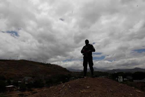 A member of the military police keeps watch during a routine foot patrol at El Pedregal neighbourhood Tegucigalpa, Honduras, May 3, 2017.