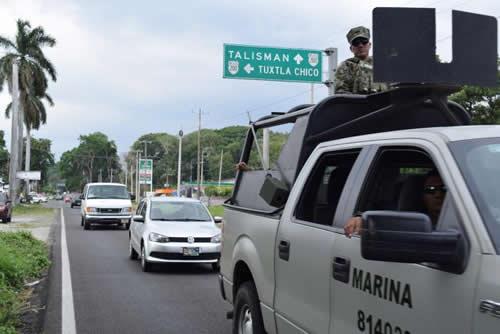 Mexican Marines patrol a road near the border with Guatemala, in Ciudad Hidalgo, Mexico, April 28, 2017. Picture taken April 28, 2017.
