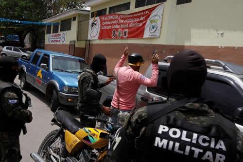 Members of the military police conduct a routine check to search a man for drugs and weapons at El Pedregal neighbourhood Tegucigalpa, Honduras, May 3, 2017.