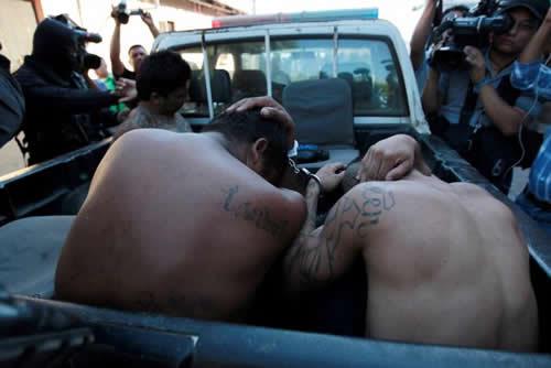 FILE PHOTO: Members of the 18th Street Gang are presented to the media after being detained under charges of trafficking and robbery in Puerto El Triunfo, El Salvador, February 8, 2017.