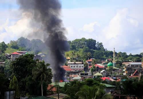 FILE PHOTO, Smoke billowing from a burning building is seen as government troops continue their assault on insurgents from the Maute group, who have taken over large parts of Marawi City.
