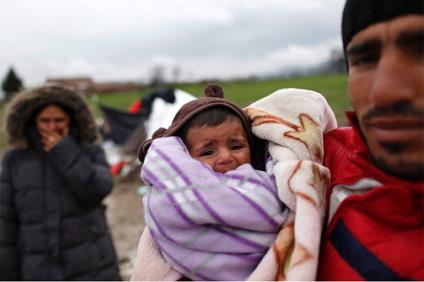 Yousif Shikhmous, a refugee from Syria, with his baby named Merkkel, are among the many refugees who are living in an improvised camp on the border between Macedonia and Serbia. (Darko Vojinovic/Associated Press)