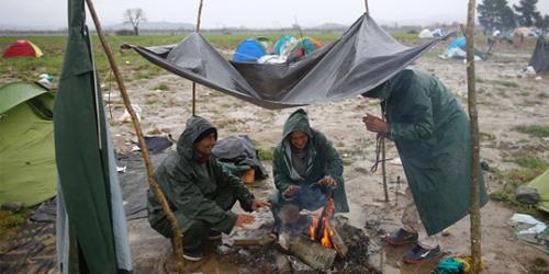 Refugees from Syria warm themselves by fire at a makeshift camp on the Greek-Macedonian border, near the village of Idomeni in Greece on March 10. (Stoyan Nenov/Reuters)