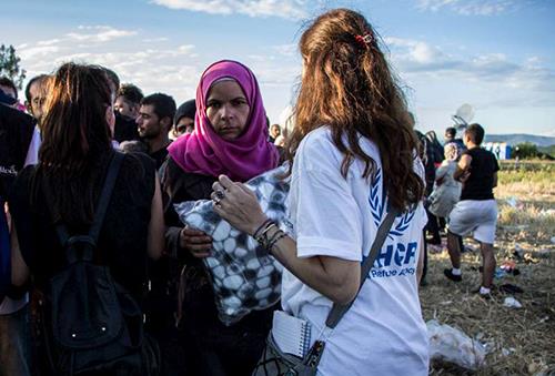 A UNHCR staff member distributes blankets to people waiting to cross the Greek-FYR Macedonian border