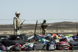 Egyptian army soldiers stand guard next to the luggage and belongings of passengers of the A321 Russian airliner