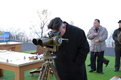 In this March 6, 2017, photo distributed by the North Korean government, leader Kim Jong Un looks through a scope at an observation point to watch the launching of Scud missiles in Tongchang-ri in North Pyongan Province, North Korea. The ruling party’s newspaper stated it was not a test to see if the missiles would work but rather a “drill” to train the troops who will “strike the bases of the U.S. imperialist aggressor forces in Japan in a contingency.” Independent journalists were not given access to cover the event depicted in this photo.