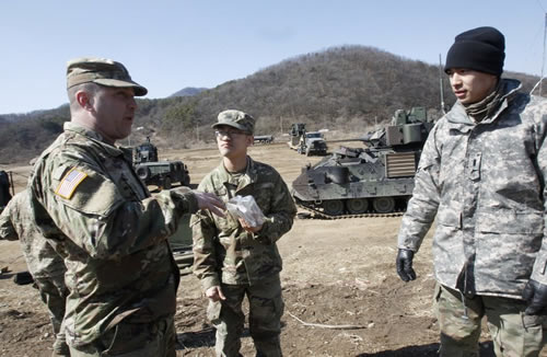 FILE – In this March 6, 2017, file photo, U.S. Army soldiers prepare for military exercises in Paju, South Korea, near the border with North Korea. According to foreign analysts, as U.S. and South Korea were having their military drills on the Korean peninsula, North Korea practiced their strike plans by launching four extended range Scud missiles.