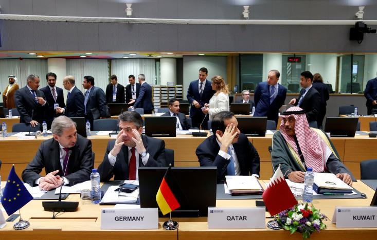 (L-R) European Neighbourhood Policy and Enlargement Negotiations Commissioner Johannes Hahn, German Foreign Minister Sigmar Gabriel, Qatar’s Foreign Minister Mohammed bin Abdulrahman al-Thani and Kuwait Foreign Minister Sabah Al Khalid Al Sabah attend an international conference on the future of Syria and the region, in Brussels, Belgium, April 5, 2017.