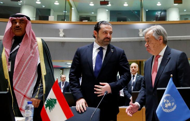 (L-R) Kuwait Foreign Minister Sabah Al Khalid Al Sabah, Lebanese Prime Minister Saad al-Hariri and United Nations Secretary General Antonio Guterres attend an international conference on the future of Syria and the region, in Brussels, Belgium, April 5, 2017.