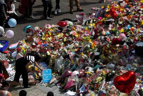City council employees move flowers from the townhall in Albert Square to St Ann’s Square in Manchester, Britain, May 24, 2017.