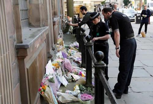 Police officers look at flowers and messages in central Manchester.