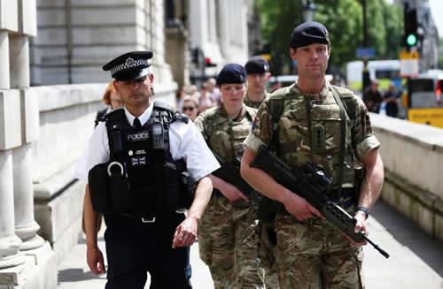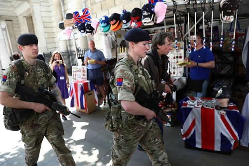 Soldiers were seen at the Houses of Parliament, Prime Minister Theresa May’s Downing Street residence and at London police headquarters at New Scotland Yard.