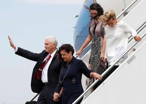 U.S. Vice President Mike Pence, his wife Karen and their daughters Charlotte and Audrey arrive at Atsugi naval air base in Ayase, south of Tokyo, Japan, April 18, 2017.