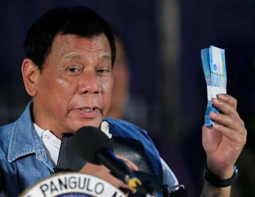 Philippines’ President Rodrigo Duterte holds Philippine Peso bills for the Marawi evacuees during his visit at the Iligan City National School of Fisheries evacuation center in Iligan City, Philippines June 20, 2017.