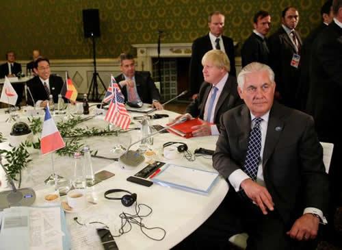 (R-L) U.S. Secretary of State Rex Tillerson, Britain’s Foreign Secretary Boris Johnson, German Foreign Minister Sigmar Gabriel, and Japanese Minister of Foreign Affairs Fumio Kishida attend roundtable talks during a G7 for foreign ministers in Lucca, Italy April 11, 2017.