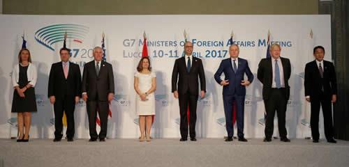 (L-R) E.U. High Representative for Foreign Affairs Federica Mogherini, German Foreign Minister Sigmar Gabriel, U.S. Secretary of State Rex Tillerson, Canada’s Foreign Affairs Minister Chrystia Freeland, Italy’s Foreign Minister Angelino Alfano, France’s Foreign Minister Jean-Marc Ayrault, Britain’s Foreign Secretary Boris Johnson, and Japanese Minister of Foreign Affairs Fumio Kishida pose for a family photo during a G7 for foreign ministers in Lucca, Italy April 11, 2017.