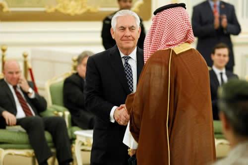 During remarks to reporters about his meeting with Saudi Arabia’s Crown Prince Muhammad bin Nayef (3rd R), U.S. President Donald Trump turns to shake hands with Secretary of State Rex Tillerson (2nd L) at the Ritz Carlton Hotel in Riyadh, Saudi Arabia May 20, 2017.