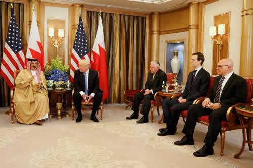 U.S. President Donald Trump (2nd L), flanked by Secretary of State Rex Tillerson (3rd R), Senior Advisor Jared Kushner (2nd R) and National Security advisor H.R. McMaster (R) meets with Bahrain’s King Hamad bin Isa Al Khalifa (L) in Riyadh, Saudi Arabia May 21, 2017.