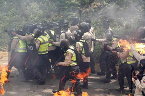 Riot police officers react to fire during a rally against Venezuela’s President Nicolas Maduro in Caracas, Venezuela.