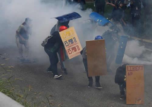 Demonstrators using makeshift shields clash with police during rally against Venezuela’s President Nicolas Maduro in Caracas, Venezuela.