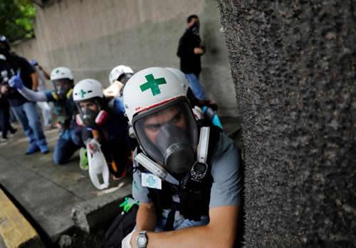 Volunteers, members of a primary care response team, kneel behind a tree during clashes with security forces at a rally against Venezuela’s President Nicolas Maduro in Caracas, Venezuela.