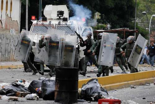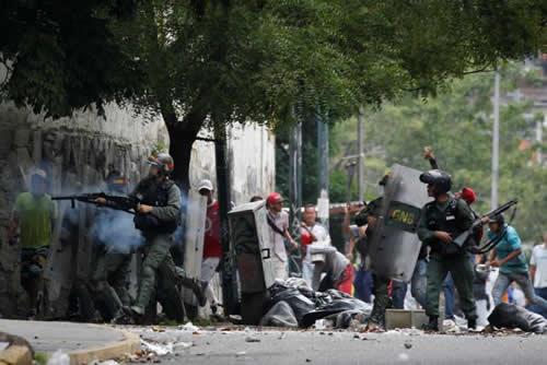 Venezuelan National guards fire tear gas toward opposition supporters during a protest against Venezuela’s President Nicolas Maduro’s government in Caracas, Venezuela May 2, 2017.