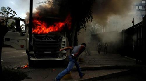 An opposition supporter runs next to a government truck that was set on fire during a rally against Venezuelan President Nicolas Maduros government in Caracas