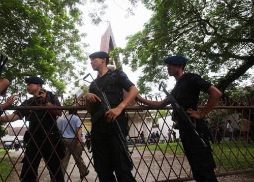 ndonesian police officers guard a church compound following an attack during Sunday Mass in Medan, North Sumatra, Indonesia